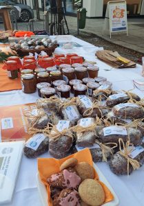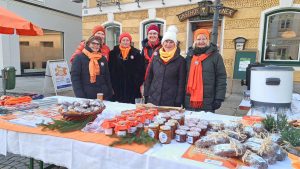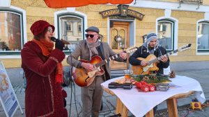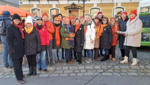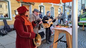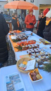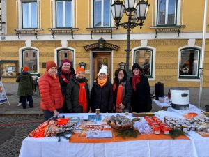 Sie mischten sich mit einem eigenen Stand unter die Marktleute und hatten dabei unter anderem heißen orangen Aperol, Kürbissuppe, Orangenmarmelade oder handgestrickte orange Socken im Angebot. Musikalisch unterstützt wurden die Soroptimistinnen von De Strawanza, die für Stimmung sorgten. Die Einnahmen der Aktion helfen dem Serviceclub berufstätiger Frauen, konkret in akuten Notsituationen zu helfen oder Projekte zu realisieren, die das Leben von Frauen und Mädchen verbessern.