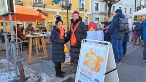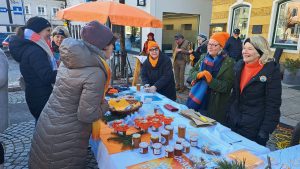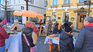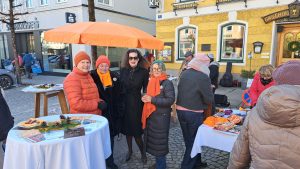 Der Auftritt beim Wochenmarkt war neben der orangen Bank, die beim Stift Schlägl aufgestellt wurde, ein weiterer Beitrag zur weltweiten UN-Kampagne Orange the World gegen Gewalt an Frauen.